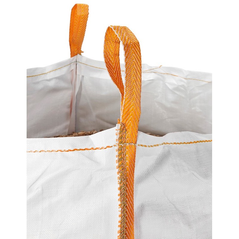 Big Bag avec jupe de fermeture, 4 sangles de levage, c’est un big bag idéal pour stocker et protéger sable, terre végétale, granulats, gravats de chantier, déchets, bois de chauffage,  pouzzolane,copeaux de bois, paillis, et autres matériaux de construction. Sac en polypropylène blanc aux dimensions 90x90x90cm, ce big bag refermable peut contenir une charge maximale de 1000kg. Conforme ISO 21898. Traité anti-UV